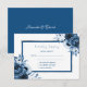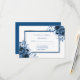 An elegant RSVP card for a wedding with templates for reply by date and names. A faux silver and classic blue frame with watercolored flowers, roses in shades of blue. A chic white background, blue text on front.