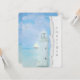 White lighthouse and sailboat on ocean with torn paper edge border on linen background for wedding or vow renewal.