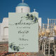A olive green background. Decorated with olives and olive leaves. Personalize and add your names and the wedding date.