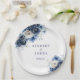 This wedding designed paper plate is shown with a romantic blue mix floral print. Text colour is navy blue.