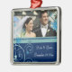 Winter Wedding photo ornament customizable with your own wedding photo and wedding date in elegant blue and turquoise with festive snowflakes and swirls pattern. A stylish christmas gift for family and friends or to decorate your christmas tree or home for the holidays. The perfect way to remember your winter wedding day.