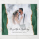 This modern wedding design features emerald green watercolor agate and gold faux glitter borders on the left and right edges. Personalize it with a photo of the bride and groom, along with their names in elegant handwriting script and the wedding date below. A white gradient filter helps make the black text pop.