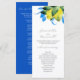 This botanical wedding program showcases vibrant watercolor lemons in shades of yellow, complemented by lush blue and green leaves. The names of the bride and groom, along with the wedding timeline, are elegantly displayed in a blend of hand-lettered script and sans serif typography. The back side features a solid Mykonos blue, creating a striking contrast. This double-sided design is perfect for Mediterranean, Tuscan, Italian, and Greek Alfresco weddings. Art and design by Victoria Grigaliunas of Do Tell A Belle. Explore more from this wedding theme at www.zazzle.com/dotellabelle.