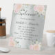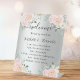 A welcome/program, timeline poster for a wedding. A stylish faux silver looking background decorated with blush pink and white flowers. Personalize and add your names and the details. Black letters.