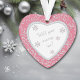 What a wonderful and romantic way to propose marriage to your sweetheart! This pretty ornament features a white heart framed in faux diamond gem images on a pretty rose pink and silver floral damask background. Inside the white heart is your text in matching silver grey, plus twinkling snowflake images. The text is fully customizable, so you may make it say whatever you'd like. There is a 2nd text field on the back, which has the same faux diamond border and inside image. This is a special keepsake gift that will be treasured forever. *Please note - the image is printed, and the ornament does not contain metal, glitter, or gems.*