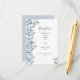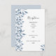 An elegant wedding reception details card in white and blue.  A chic white background on the front. Decorated with watercolored botanical silver blue coloured sprigs and foliage.  Templates for your wedding reception details, dark grey text.