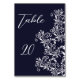 Wedding Reception Navy and White Elegant Table Number Cards designed with stylish white decorative trim on a navy background. The text includes: TABLE and a number. To personalize, simply insert one number for each table card required. Note the table number automatically repeats on the reverse side. Be sure to view the entire Wedding Navy and White Elegant Style Collection for matching cards and accessories.