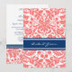 Wedding reception invitation cards for separate reception in elegant and contemporary dark navy blue, peach orange pink and white elegant and chic classic floral damask vintage pattern. Customize these invitations with your wedding details to invite your guests to your celebration after a private or destination wedding. Available in matching products for all of your wedding needs.