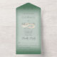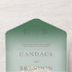 This simple yet elegant design has a modern look, with two interlocked gold wedding rings on a soft white blur overlay on a pine green background. Personalized All-In-One invitations are a unique combination of both a beautifully printed custom invitation with an easy to tear off perforated RSVP postcard. And they are so easy to use! You simply fold, then seal the back flap with the three included clear stickers, and mail. And when your guests receive your custom invite, they just tear the perforated RSVP Card off and drop it back in the mail to you!