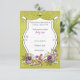 This purple, green, and white watercolor floral wedding invitation has a whimsical hand-drawn text area outlined in black with assorted watercolored flowers in various shades of pink, purple, and peach with olive green and golden yellow leaves along the bottom of the invitation that are also outlined in black. The background is a FAUX green foil look. If you require any matching items in this design, or if you need help customizing it with your info, please email niteowlstudio@gmail.com. ****PLEASE NOTE that everything will print as it appears on your monitor.