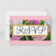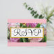 Wedding RSVP written in elegant black script inside geometric white and gold colour rectangle. Soft pastel and medium pink roses in background, Personalize backside in gold colour and black typography against crisp white background. Original Photography and Design by TamiraZDesigns.