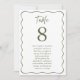 Make a sophisticated statement with this elegant 5" x 7" double-sided wedding table number and guest list card, featuring a graceful olive green wavy frame border on both sides for a polished, cohesive look. Designed in timeless olive green on crisp white, this template showcases a bold serif table number, italicized guest names, and the word “Table” in a chic handwritten script font. Both sides of the card are identical for easy viewing from any angle—ideal for weddings, rehearsal dinners, engagement parties, or anniversary celebrations. Personalize with your guest names and table details, or update the colour to match your event theme. Coordinates beautifully with our full olive green wedding suite featuring modern script and minimalist design.
