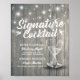 Signature Cocktail Drink Menu Wedding Decor Poster Templates - Elegant Lettering Script, Vintage Champagne Glasses and String Lights on Rustic Wood Background.