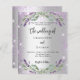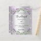 A modern, stylish wedding invitation. A faux silver looking background with violet faux glitter, sparkles, lavender florals, flowers and eucalyptus greenery. Personalize and add your names and the details.