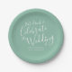 Green modern white text script and white heart wedding paper plates. Typographical text reads Eat, drink & celebrate the wedding of then add your own names underneath. A great personalized addition to your wedding buffet or party tables. Other matching items and colours available in this design. © Original design by Sarah Trett www.sarahtrett.com for www.mylittleedenweddings.com