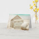 An intricately designed card with a floral border rests on the sand alongside seashells, with a vivid turquoise sea in the background