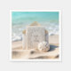 A beautifully embossed wedding invitation card rests inside an envelope on the sand near the ocean's edge, accompanied by a sand dollar.