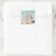 A beautifully embossed wedding invitation card rests inside an envelope on the sand near the ocean's edge, accompanied by a sand dollar