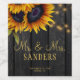 Modern newlyweds name wedding personalized wine label with a yellow gold sunflowers bouquet over a dark brown barn wood with string lights. ++++++++++ Easy to customize with your name and text! +++++++++ It can be a pretty gift for the new couple, a party table decor, or a wedding thank you favour.