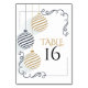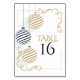 Wedding Table Number Card | Modern Black and Gold Minimal Holiday Baubles - Original design by ©WhimsicalArtwork™ - Three black and gold striped Christmas ornaments hang at varying levels - paired with gold corner scrolling and a contemporary font make this a nice addition to a very unique avant-garde wedding invitation suite - customize with your information easily - this is part of the Modern Black and Gold Minimal Holiday Baubles Collection A combination of script calligraphy combined with a minimalist, contemporary style text layout makes it a trending style wedding suite. This is part of a wedding stationery collection with matching wedding accessories by the BarefootBride™.