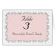 Lovely wedding reception table number card done in white and pink. A delicate silver scroll frame surrounds the pink text area. Text is fully customizable in font style, colours, and sizes.