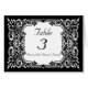Lovely wedding reception table number card done in black and white. A ornate baroque style frame, in black and white, surrounds the white text area. Text is fully customizable in font style, colours, and sizes.