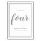 This design was created for smaller intimate wedding celebrations. Simple, minimalist and elegant Wedding Table Number FOUR design features a contemporary design with a double frame border in grey on a crisp white background. The chic design provides timeless yet modern sophistication. Personalize wedding table design with your wedding details in trendy ultimate grey lettering and script. The back of the card is a duplicate of the front. Order one for every table with the individual table numbers.