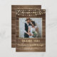 Your wedding photo is accented with a rustic, country, brown weathered wood plank background and soft yellow glow string lights along with the editable title of THANK YOU and your wedding date in a country western hand-printed font and your names in a rough brush script font. The back of the card features the same wood plank background and offers a place to type a general thank-you message (or delete the sample text to leave blank for personal handwritten notes of appreciation). PHOTO TIP: For fastest/best results, choose a photo with the subject in the middle and/or pre-crop it to a square shape BEFORE uploading. Contact the designer via Zazzle Chat or makeitaboutyoustore@gmail.com if you'd like any customization or want coordinating items.