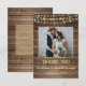 Your wedding photo is accented with a rustic, country, brown weathered wood plank background and soft yellow glow string lights along with the editable title of THANK YOU and your wedding date in a country western hand-printed font and your names in a rough brush script font. The back of the card features the same wood plank background and offers a place to type a general thank-you message (or delete the sample text to leave blank for personal handwritten notes of appreciation). PHOTO TIP: For fastest/best results, choose a photo with the subject in the middle and/or pre-crop it to a square shape BEFORE uploading. Contact the designer via Zazzle Chat or makeitaboutyoustore@gmail.com if you'd like any customization or want coordinating items.