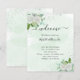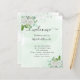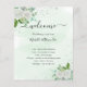 A watercolored green background, decorated with white florals, eucalyptus greenery, and faux silver glitter dust. Personalize and add your names and your wedding day timeline.