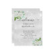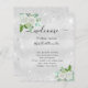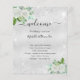 A faux silver metallic looking background, decorated with a white watercolored white florals, eucalyptus greenery, and faux silver glitter dust. Personalize and add your names and your wedding day timeline.