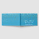 This guest book is shown in Turquoise Blue with a curtain of golden-coloured petite stars on both front and back are splattered all over this guest book. Front has text reading your two personalized names in a fancy script, your last name in bold text style.