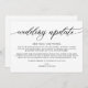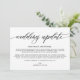 Modern simple wedding update announcement card. Design features calligraphy script ''wedding update'' and details in trendy capital lettering.