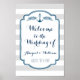 Customizable welcome to our wedding sign poster with wide vintage stripes pattern and classic nautical ships anchor and floral details in dark navy blue, grey and white.