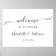 Welcome to an elegant wedding. Personalize and add the names of the bride and groom and a date. White background, black text. Welcome is written with heart swashes. A wedding is a celebration of love, lasting forever in the hearts of those who witnessed it.