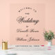 A simple but elegant transparent wedding welcome sign. The word Wedding and the names of the bride and groom are written in an elegant calligraphy, the rest in caps. All text is black. The words Welcome to are arched above all the rest.
