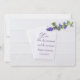 White wedding invitation with envelope and purple flowers on white wood.