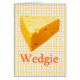 Yellow plaid background with a block of cheese, labelled Wedgie