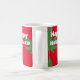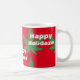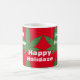 Weed Leaf Christmas Happy Holidaze mug. Festive green weed leaf on red background and white wood effect text that says, "Happy Holidaze." Funny red and green mug for the holiday season.