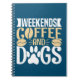 Dog lovers who also love coffee will love this design on bags, mugs, T-shirts, and more with text of tan and white with coffee beans and a dog paw print that reads Weekends Coffee and Dogs!