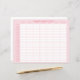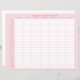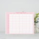 This medication tracker features a pink background with a grid that includes times by the hour on the left side and days of the week on the top side. You can personalize with your name.