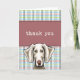 Make someone smile while expressing thanks with this original design by Off-Leash Art featuring a Weimaraner dog against a blue, green and red plaid background.