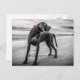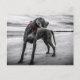 Photo d'un chien de Weimeraner sur une plage debout en regardant en arrière. Photo convertie en noir et blanc à l'exception du collier de chien qui est rouge.