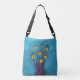 Weird monster all over printed shoulder bag with a digital illustration of a funny tree creature with seven glowing yellow eyes over petroleum blue background. Fun and cool bag which is right for you if you like creepy funny characters and creatures.