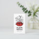 Makeup artist business card with a weird lips gothic design featuring an ink drawing of a mouth with red lipstick decorated with white dots and strange swirls.