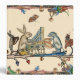 Medieval bestiary playing musical instruments. ,White Rabbit And Dog Playing Organ, Harpist Hare, Snail Cat ,Digital collage by Bulgan Lumini ©