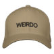 Fits well due to elastic edging, not adjustable. Good qualty material. Good quality embroidering. Subtle lettering (white on beige) just as my wife likes.