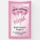 Welcome to my 100th Birthday Party. This is a large, pink and white banner with text templates to make it easy for you to change the text to your own event, words, date, name, or monogram. You can personalize any of the text using the supplied text templates. There are balloons in the background and a number pattern with the number 100 scattered around the frame.