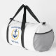 Personalized travel duffel bags featuring a custom designed nautical boat anchor, gold style laurel leaves and a gold star with "Welcome Aboard" and your name or boat name. This design is in navy blue and gold colours on white or edit the design and easily change the bag to any desired colour. 2 bag sizes to choose from. Makes a great gift.
