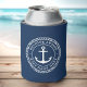 Can cooler featuring a white, elegant anchor and rope emblem with custom text "welcome aboard" and your boat name on a dark blue background..